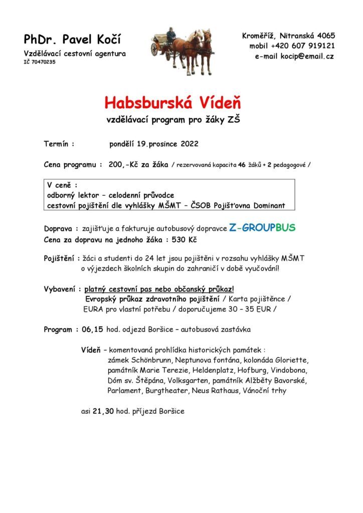 Vzdělávací program – VÍDEŇ Termín konání: 19. 12. 2022 Všichni přihlášení účastníci musí mít platný cestovní pas nebo občanský průkaz. Zálohu 730 Kč přinesou do 16. 10. 2022 paní učitelce Daníčkové.