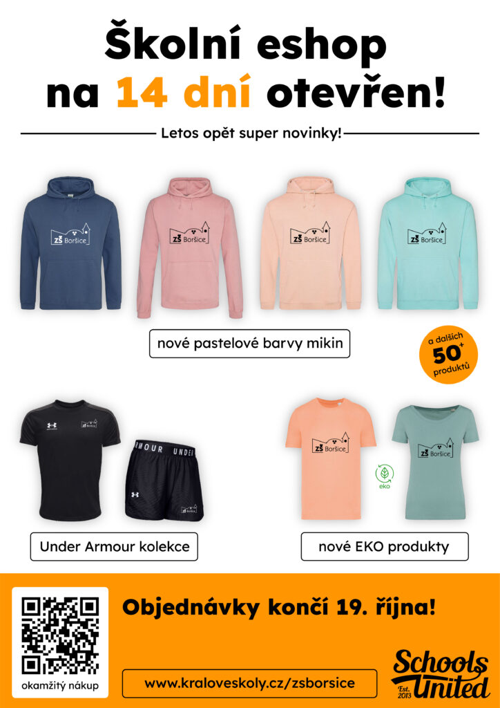 Do 19. 10. 2023 je spuštěn e-shop se školním oblečením ZDE: https://www.kraloveskoly.cz/zsborsice/