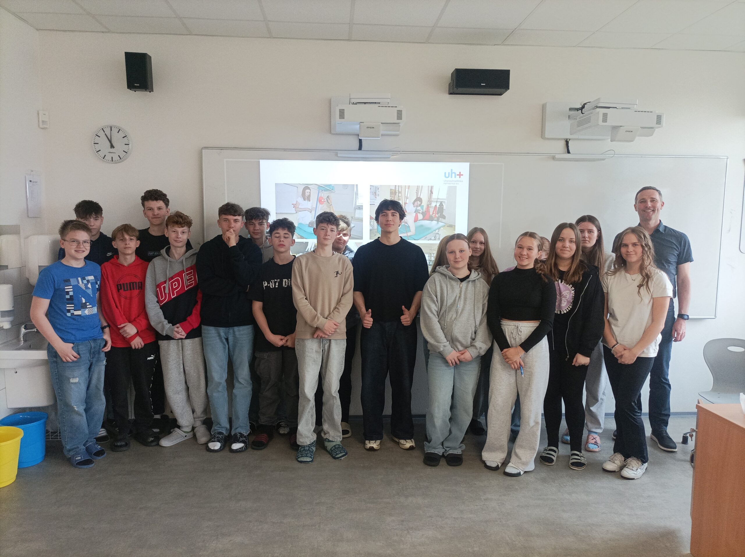 Podobně jako v minulých letech, i letos v dubnu k nám zavítal tým z Uherskohradišťské nemocnice, tentokrát reprezentovaný pouze pR manažerem Davidem Vacke, aby se setkal s žáky osmých tříd a uvedl je do možností studia na středních zdravotnických školách, vyšších odborných, případně vysokých školách. Sešli jsme se ve středu 2. dubna 2025. Davida Vacke doplnili student a studentka 3. ročníku Střední zdravotnické školy UH. Kromě teorie si žáci vyzkoušeli i praktický kvíz, kdy poznávali pár zdravotnických pomůcek a hledali jejich využití při léčbě pacienta.