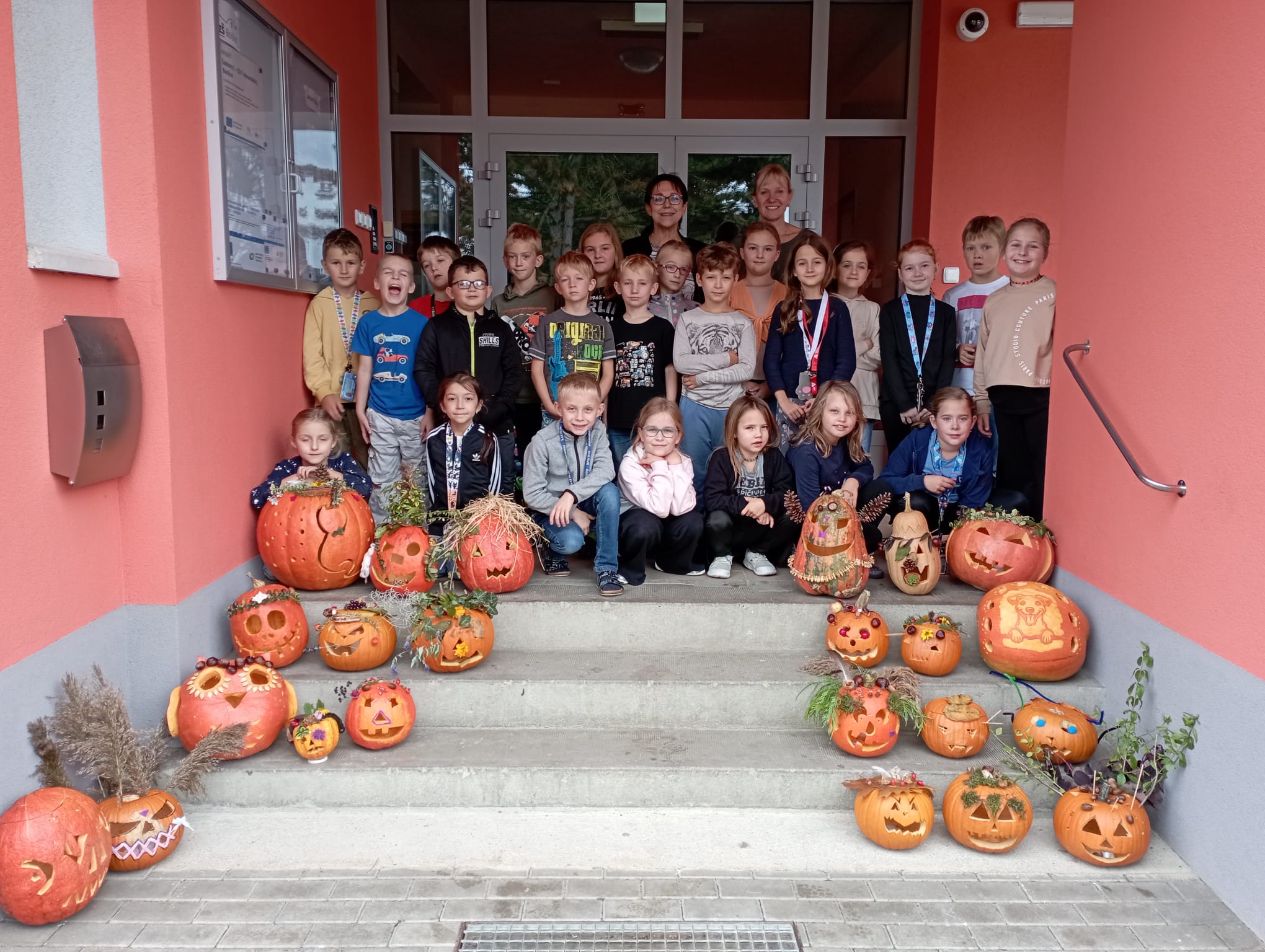 Příjemné dopoledne uteklo velmi rychle a na konec se všichni vyfotili se svými dýňovými lucernami, které se rozsvítí v páteční podvečer před budovou základní školy.