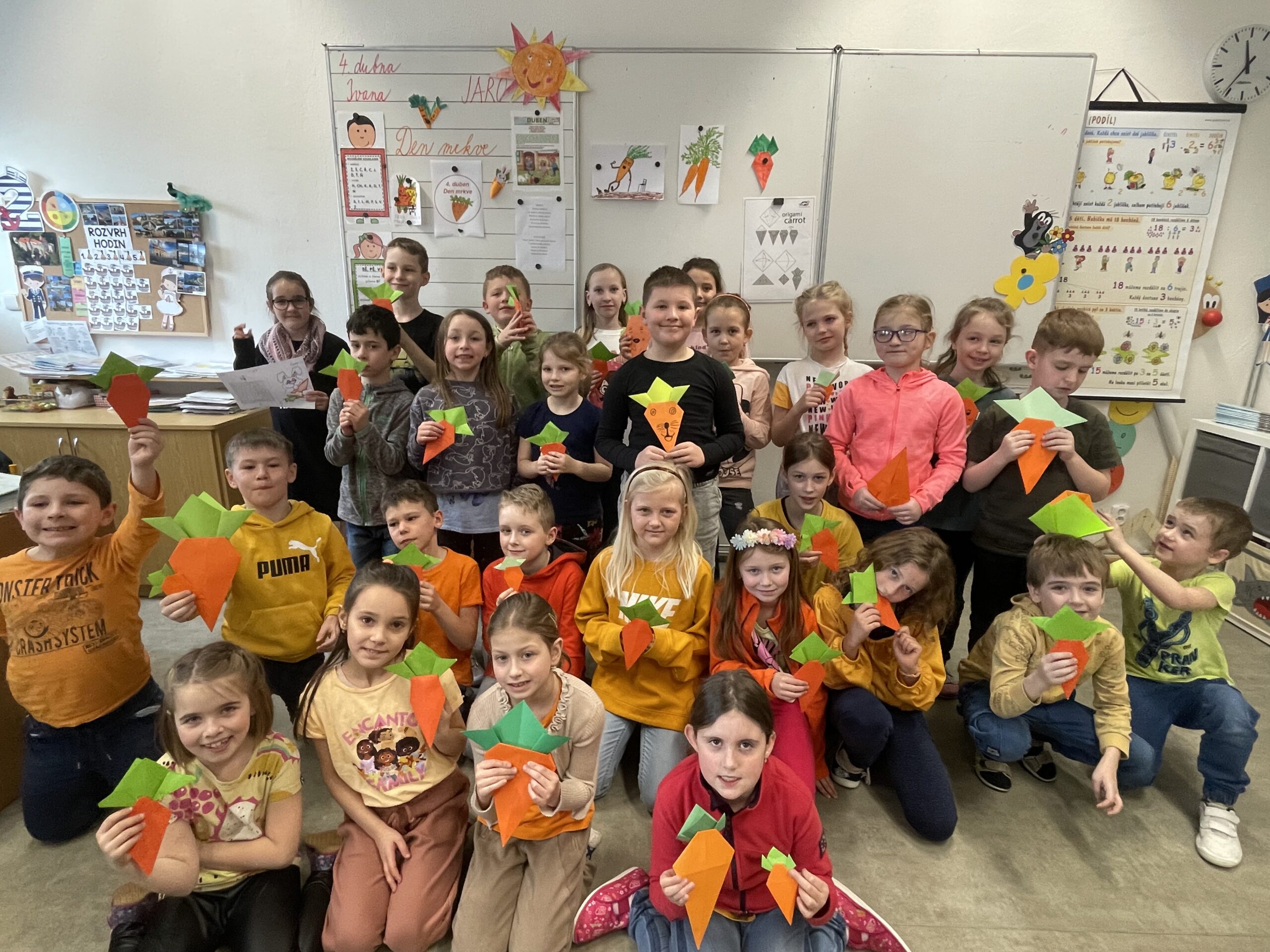 V rámci oslav mezinárodního dne mrkve, který se slaví každý rok přesně 4. dubna, se zapojili i žáci druhých tříd. V českém jazyce jsme pracovali s textem, který se tohoto tématu týkal, v pracovní výchově si vyrobili mrkvové origami. Celý den se nesl v duchu a barvách mrkve, jak oblečením žáků, tak i různými výrobky a samozřejmě mrkev nechyběla v různých podobách i ke svačině.