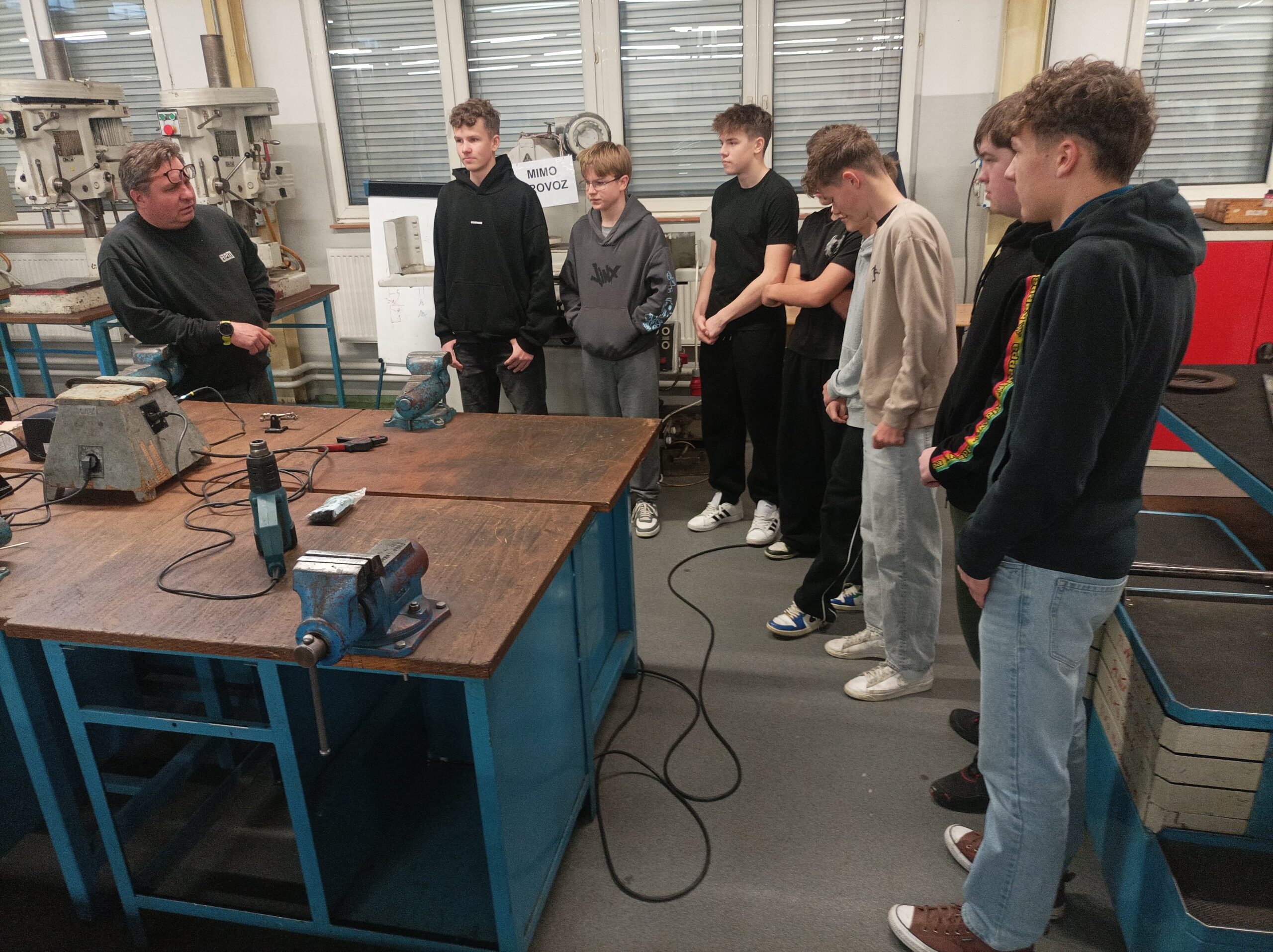 Ve středu 26. listopadu 2025 jsme s vycházejícími žáky a částí 8. třídy navštívili odborné učiliště v Uherském Hradišti na Mojmíru, které patří pod SOU a Gymnázium Staré Město. Žáci se rozdělili do čtyř skupin a prošli si čtyři stanoviště: pájení kabelových spojů, práce s robotickou rukou, CNC stroje a jeho programování, truhlářská dílna. Žáci si vyrobili stojánek na mobil a naprogramovali výrobu kovového otvíráku, pomocí robota nakreslili obrázek a spájeli si kabelový spoj. Vše bylo perfektně nachystáno i zorganizováno. Děkujeme učitelům odborného výcviku za organizaci zajímavého dopoledne. Smyslel bylo ukázat žákům nejen prostory školy, ale také zažít, jak se na své budoucí povolání připravují starší žáci. Fotogalerii naleznete zde.
