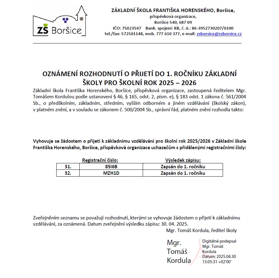 Oznámení rozhodnutí o přijetí do 1. ročníku základní školy pro rok 2025 – 2026