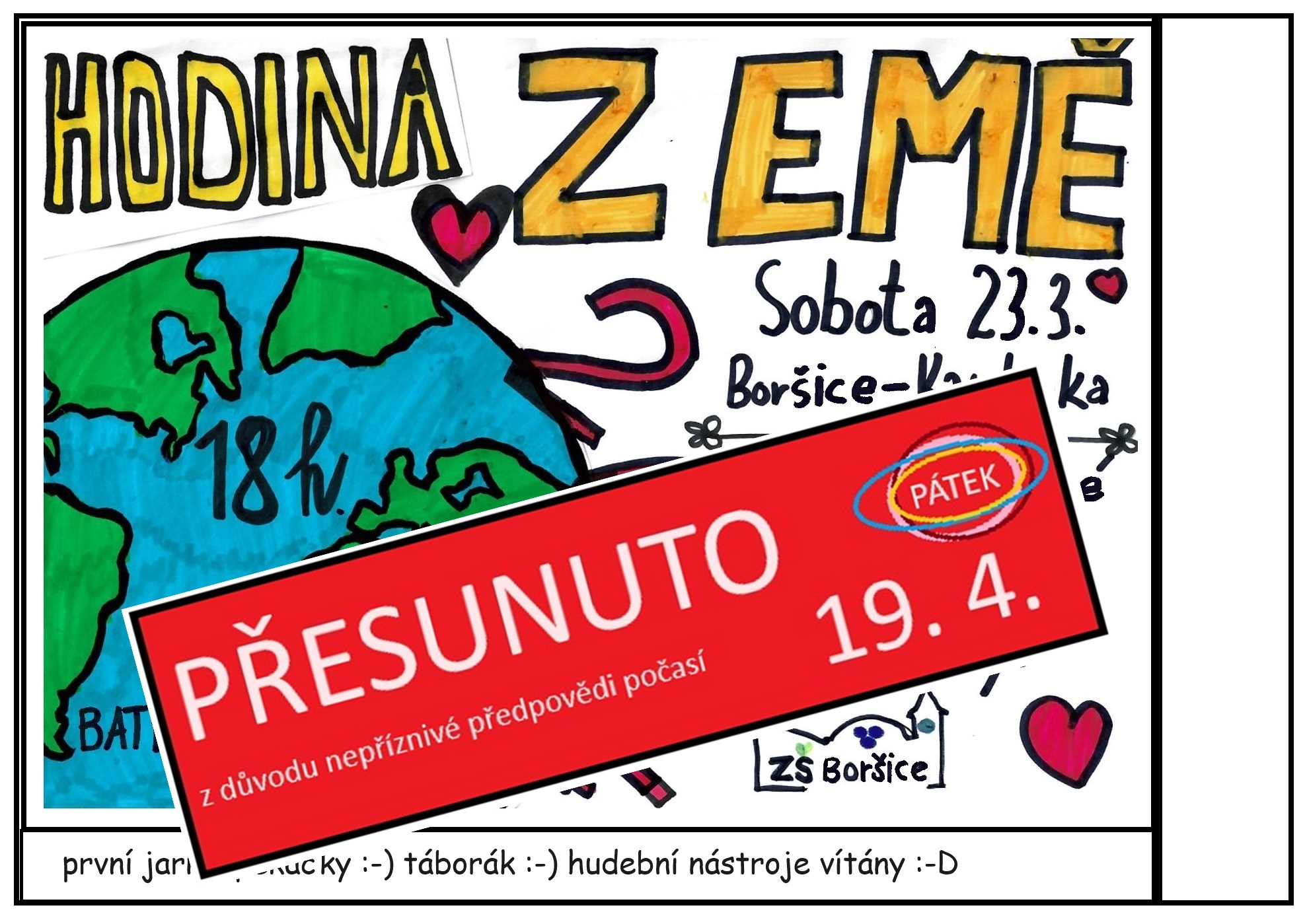 Z důvodu nepříznivé předpovědi na zítřejší- sobotní odpoledne a večer jsme nuceni PŘESUNOUT naši parlamenťáckou akci HODINA ZEMĚ na pátek 19. 4. 2024 v 18 hodin.