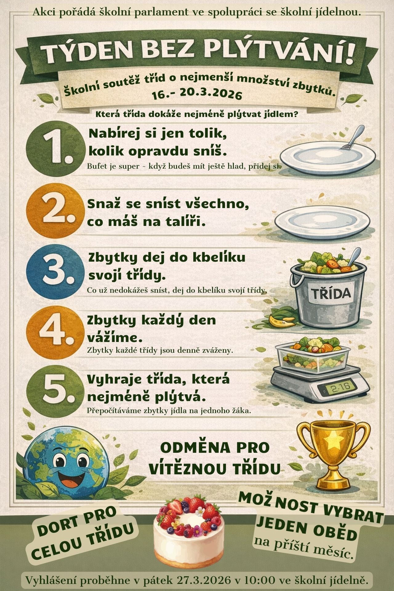 V týdnu 16.–20. března 2026 proběhla na naší škole akce Týden bez plýtvání, kterou pořádal školní parlament ve spolupráci se školní jídelnou.