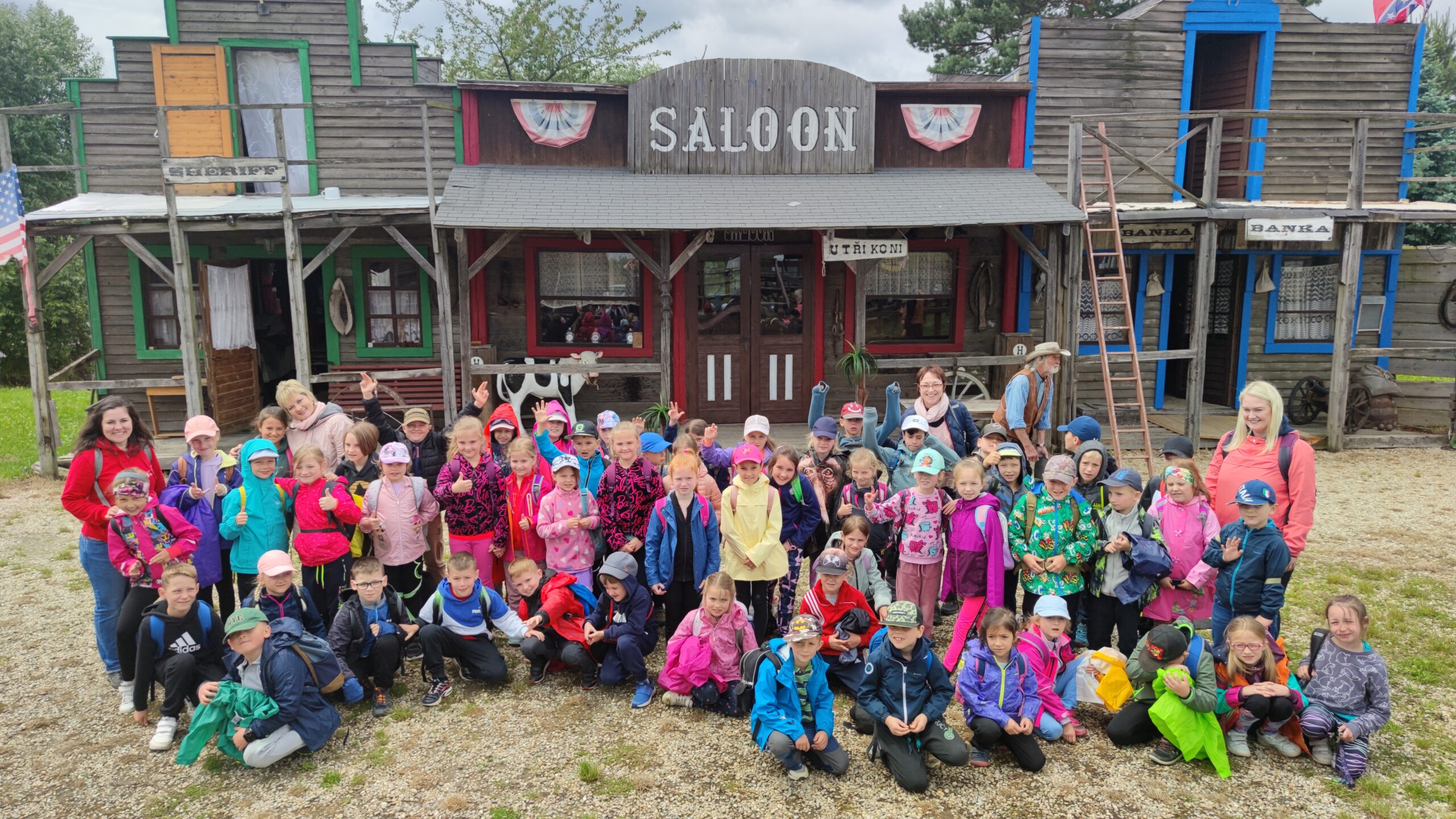 Ve středu 12. 6. 2024 se na výlet vydaly i obě první a druhé třídy. Počasí nám dopoledne nepřálo, ale naštěstí se aktivity odehrály v kryté hale, kde se žáci setkali s kovboji, zlatokopy, indiánkou a jinými. Vyzkoušeli si např. házet šípem, ale i lanem, jezdit na koni, rýžovat zlato, poznávali zvířata podle ulovených kožešin. Žáci se mohli setkat s hercem a režisérem Stanislavem Veselým, který byl na jednom ze stanovišť. Hrál v mnoha pohádkách, českých i zahraničních filmech. Jízdou na koni je provázela mistryně Evropy v jízdě na koni Eva Kovaříková. V poledne se na nás počasí již usmálo a kovbojské představení jsme zhlédli ve venkovním areálu, kde nám kovboj předvedl i úžasnou práci s bičem i za asistence vybraných paní učitelek.